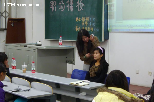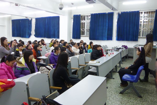 培训会是由校拉拉队、校摄影协会首席专职化妆师主讲,同时运用PPT,现场化妆,现场讲解三合一的新颖方式为在座同学呈现了一场美丽化妆的视觉盛宴。一个主讲,两个辅讲分别分布在大教室的三个位置,便于全场观众都能看到化妆的全过程,使美丽能更好的呈现在同学们的眼前。会上,讲师主要从底妆,眼妆,眉唇妆三个大方面进入主题并介绍了睫毛膏、睫毛器、口红、腮红等化妆用品的用法和注意事项及眼线等的画法并主张给职场女人自信,美丽而不张扬的淡妆风格。会上,全场观众仔细聆听和记录培训要点,气氛十分和谐。