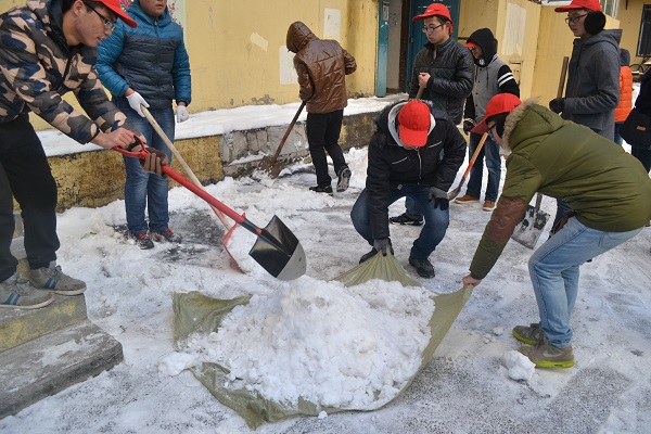 12月5日,上午8时50分,bv1946伟德国际始于英国“小红帽”志愿者服务队队员于21b门口集合,前去建设社区进行除雪活动。此次活动由公益部部长孙东栋带队,各部副部长以及部员都参与到了此次除雪活动中。