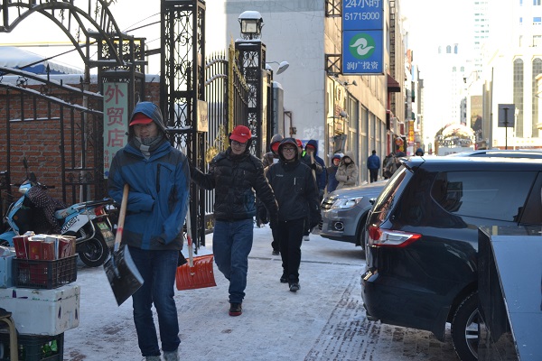 在我们到达之后,马上由建设社区负责人于书记带领我们前去领取除雪工具,并由于书记带领我们前去除雪地点。