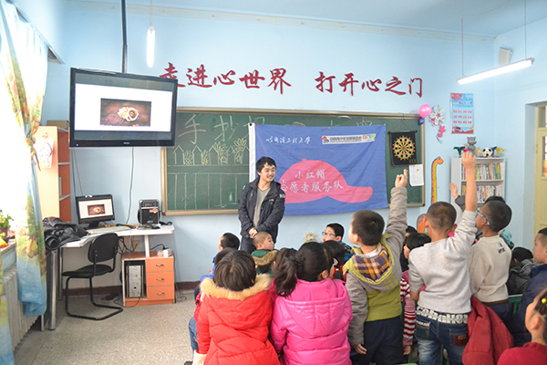 为了突出我们的学院特色,吕文川为孩子们准备了关于海洋的知识,为孩子们讲解了海底的各种生物,引起了孩子们的阵阵感叹。李兴宇给孩子们带来的是各种珍稀动物的讲解,开阔了孩子们的眼界。李珂垚给同学们讲解了“沙漠之魂”——胡杨,介绍了胡杨坚忍不拔,顽强不屈的精神。
