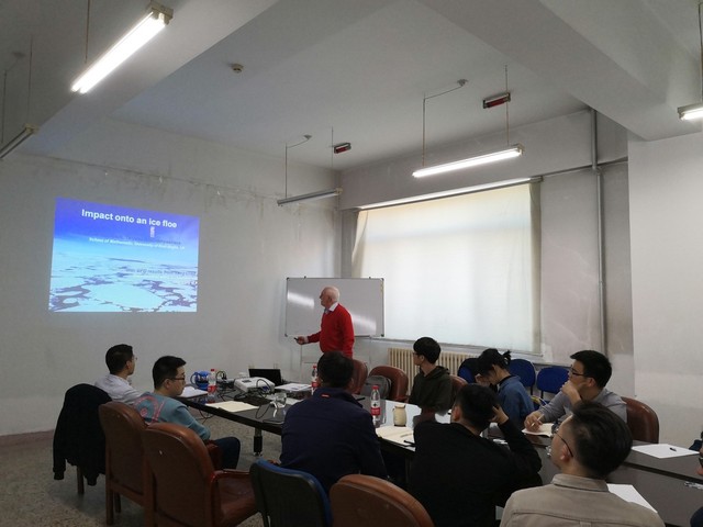 英国东安格利亚大学是英国一流学府,也是全欧洲乃至全世界最重要的科研中心之一。Aleksandr Korobkin教授在流体与结构物相互作用方面取得了非凡的成就,得到国际社会的广泛认可,于2009年获得了著名的船舶流体力学最高奖项“温布洛纪念讲学奖(Weinblum Memorial Lectureship)”,Tatyana Khabakhpasheva副教授在冰水动力学的研究成果丰富,发表顶级学术论文以及期刊论文100余篇。在本次讲坛中,Aleksandr Korobkin 教授和Tatyana Khabakhpasheva副教授对分别对“冰道中的水弹行波”、“动载荷或水下运动物体产生的水弹行波”、“波与垂直圆柱体的相互作用”、“水与碎冰的碰撞”、“进出水问题的半解析模型”、“从水面快速提升圆盘的实验与理论”等相关问题进行交流报告,解答了学生们对于流体与结构物相互作用、冰水动力学、水弹性波等方面的相关问题。