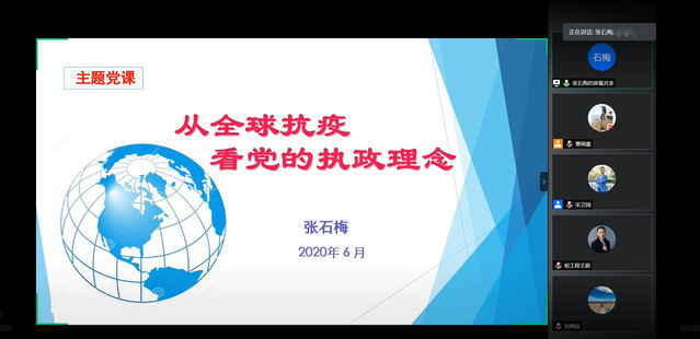 6月29日,院党委书记张石梅为院直党支部讲了题为《从全球抗疫看党的执政理念》的专题微党课。