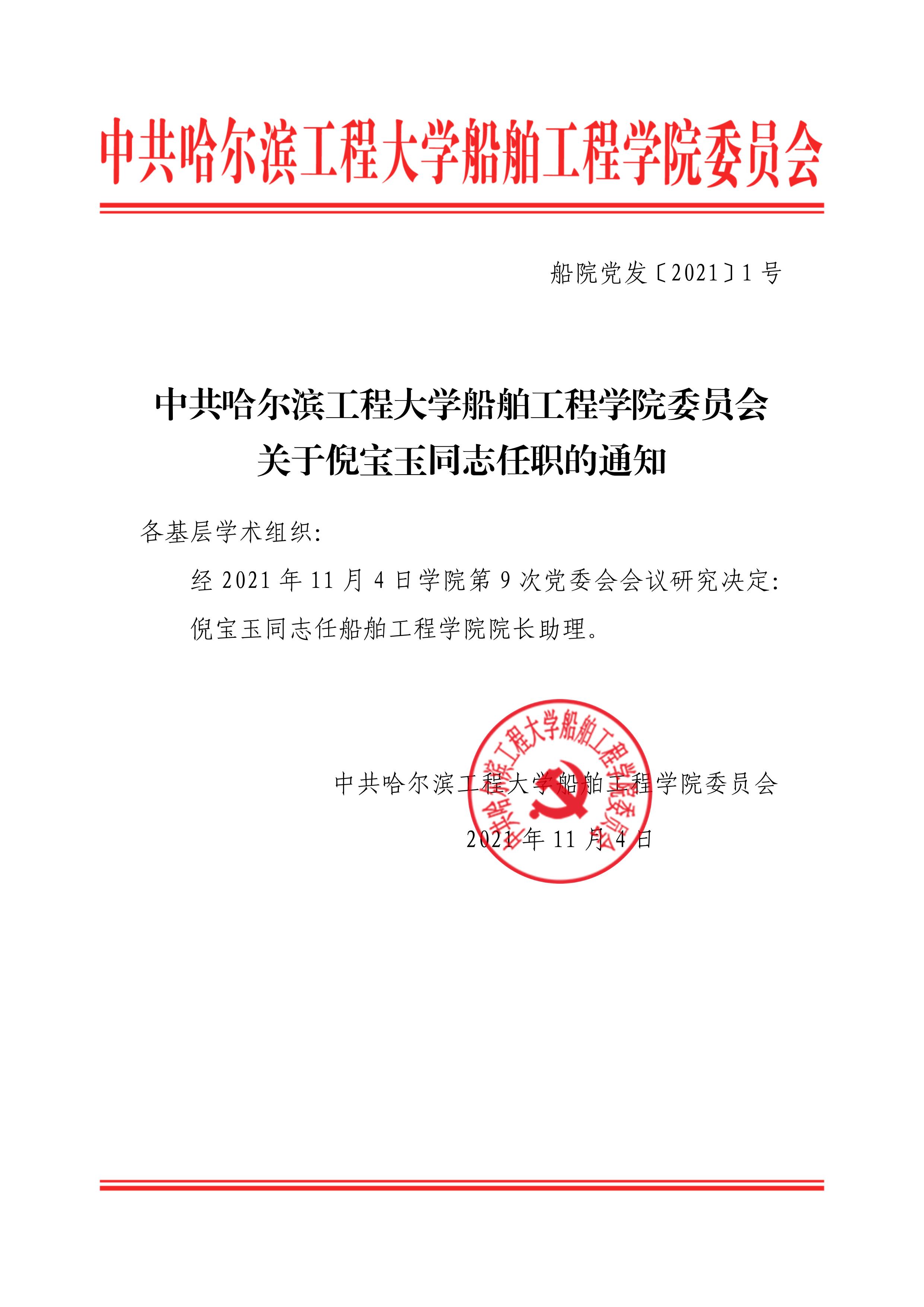 中共bv1946伟德国际始于英国委员会关于倪宝玉同志任职的通知(船院党发〔2021〕1 号 )