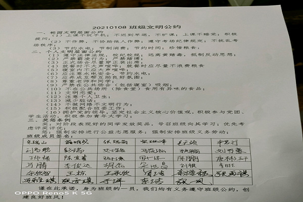 此次班级公约活动旨在让同学们通过对班级公约的共同制定与签署养成遵守规矩的意识,能够自觉地执行公约内容,也有助于同学们将条款行为内化为自身素养。同时,班级公约对建设良好班风,学风也有所脾益。