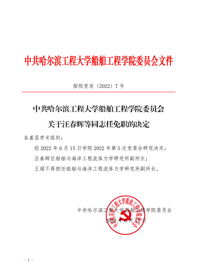 中共bv1946伟德国际始于英国委员会关于汪春辉等同志任免职的决定 船院党发〔2022〕7号