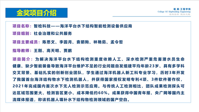 3月17日至19日,第十三届“挑战杯”中国大学生创业计划竞赛全国决赛举行终审答辩。王刚老师指导的“智检科技——海洋平台水下结构智能检测设备供应商”获得金奖!