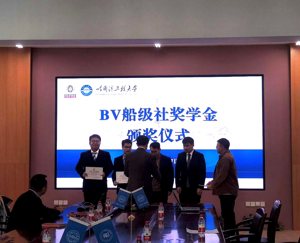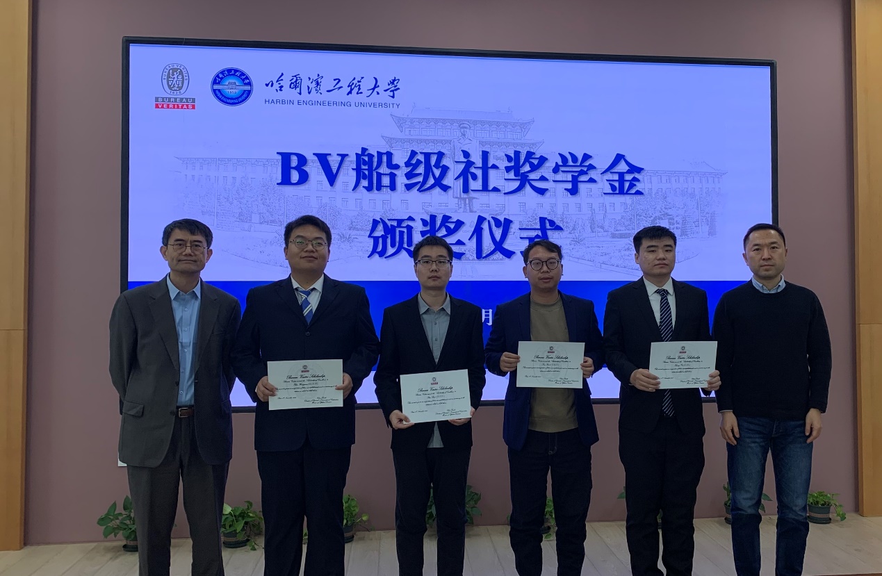 由马松宣读法国船级社奖学金获奖名单,陈小波博士为获奖同学颁发证书。