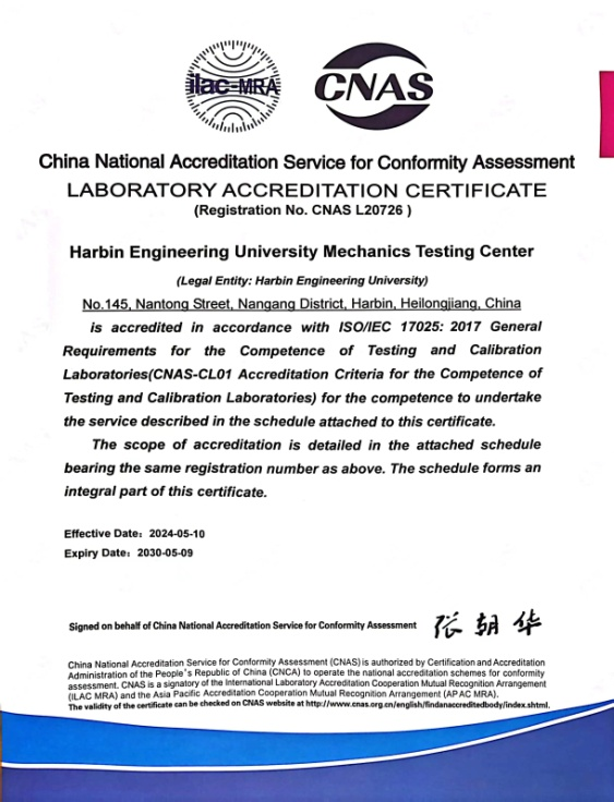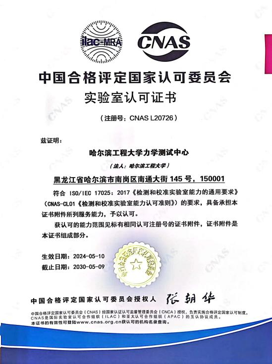 测试中心通过CNAS认可,标志着中心具备按照国家级标准进行力学检测的技术能力,建立了符合国家标准的质量管理体系,检测报告更具有权威性、互认性和公信力。
