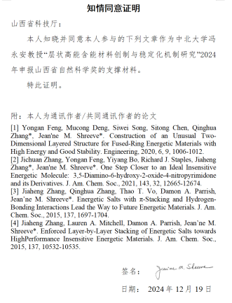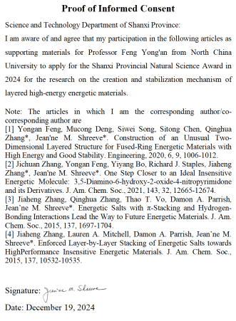 M. Shreeve作为代表作1、3、4、5的通讯/共同通讯作者,知情并同意冯永安将该论文作为代表性论文申报2023年度山西省科学技术奖(自然科学类)。