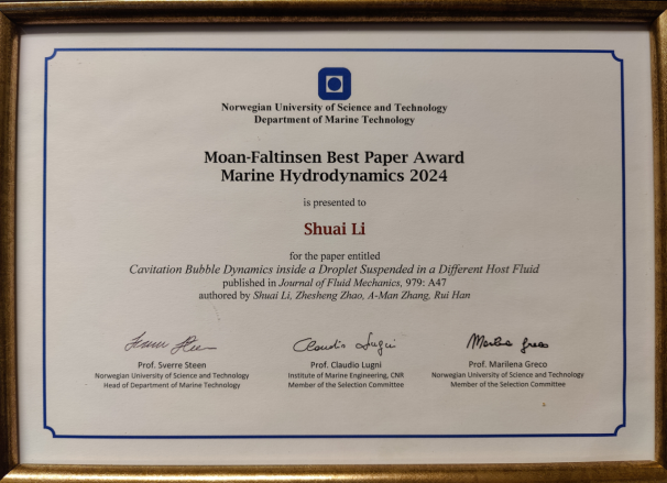 近日,学院李帅副教授发表在流体力学顶级期刊《流体力学杂志》(Journal of Fluid Mechanics)的论文《悬浮于异质流体中的液滴内空化气泡动力学》(Cavitation bubble dynamics inside a droplet suspended in a different host fluid)荣获2024年度蒙恩-福尔廷森最佳论文奖(Moan-Faltinsen Best Paper Award)。