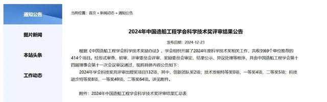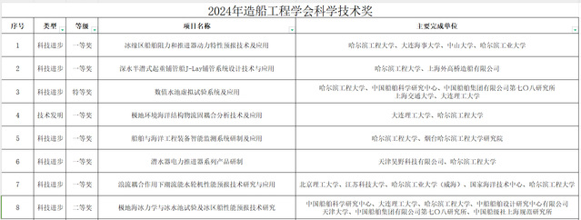 近日,中国造船工程学会公布了2024年度科学技术奖评审结果,本次评审出授奖项目132项,其中,创新团队奖2项;技术发明特等奖0项,一等奖4项,二等奖5项;科技进步特等奖8项,一等奖49项,二等奖64项。由学院牵头项目获科技进步一等奖2项,参研项目获科技进步特等奖1项、一等奖3项、二等奖1项,技术发明一等奖1项。