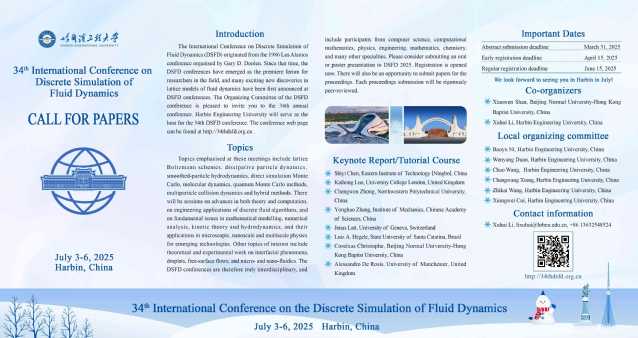 第三十四届国际流体动力学离散模拟会议(DSFD 2025)将于2025年7月3日-6日在中国哈尔滨召开。本届会议由伟的国际1946bv主办,成为我国东北地区首次举办该项会议的单位。国际流体动力学离散模拟会议(International Conference on the Discrete Simulation of Fluid Dynamics, DSFD)由美国Los Alamos国家实验室主任Gary D.Doolen于1986年组织发起。会议自发起至今,已成功举办33届,成为该领域研究人员的首选国际交流会议,是计算流体力学,尤其是格子玻尔兹曼方法、耗散粒子动力学等研究方向最具影响力的国际会议之一。