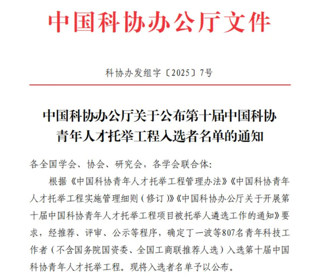 中国科协青年人才托举工程是中国科协于2015年10月首次立项的国家级青年人才计划,主要是大力扶持有较大创新能力和发展潜力的32岁以下的青年科技人才,助力他们成为高层次领军人才和高水平创新团队的后备军。本届项目围绕“四个面向”,以能力、素质、潜质为标准,重点支持从事基础研究和原始创新的青年科技工作者,从事集成电路、工业母机、基础软件、先进材料、科研仪器、核心种源等关键核心技术攻关的青年科技工作者,从事新一代信息技术、人工智能、量子科技、生物科技、新能源、新材料等新兴产业、未来产业领域科技创新的青年科技工作者。