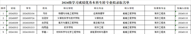 2024级学习成绩优秀本科生转专业拟录取名单,