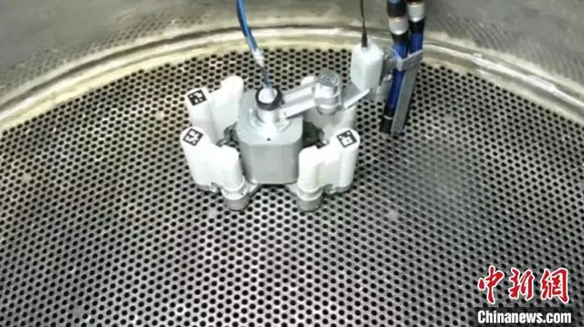 该机器人采用独特的四足锚爪结构,具备变姿态快速爬行能力,实现了机器人四足爬行与检测功能同步完成,能够有效提升传热管检测效率。王刚教授介绍,核电站蒸汽发生器传热管是核能安全的“主动脉”,传热管疲劳、缺陷、腐蚀如果未能及时发现,便有可能破裂造成安全事故。每根传热管外径十几毫米,管壁非常薄,数量近万根。以往,传热管检测机器人每走一步只能覆盖近20个管孔,检测完所有传热管一般需要10多天,耗时长、成本高。针对传统传热管检测机器人难以适配多种蒸汽发生器型号、检测时间长等问题,科研团队研发出该型四足传热管检测机器人,采用四足构型、高效运动规划、视觉定位等技术,为核电设备智能运维提供了新型解决方案。