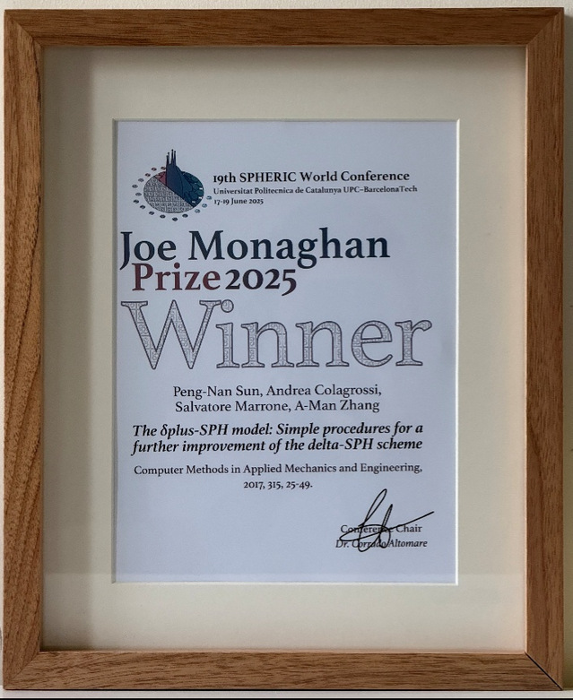 “乔·莫纳汉奖”由全球120余所高校与科研机构组成的SPHERIC国际学术组织设立,是光滑粒子流体动力学(SPH)研究领域公认的国际最高荣誉之一,自2015年设立以来,每3年评选1次,每次表彰1项在光滑粒子流体动力学基础理论或核心技术方面取得突破的重要成果。今年,包括英国曼彻斯特大学、德国慕尼黑工业大学、日本京都大学等在内的多所国际知名高校共12篇论文入围提名,最终学院张阿漫教授等共同完成的论文《The δplus-SPH model: Simple procedures for a further improvement of the delta-SPH scheme》经大会投票评选脱颖而出,获颁该奖项。