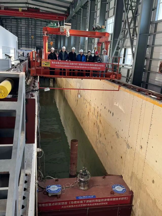 近日,学院与哈电集团哈尔滨电机厂有限责任公司联合攻关研制的新型振荡水柱式波浪能发电装置样机,在交通运输部天津水运工程科学研究院大型水动力实验基地顺利通过现场测试。