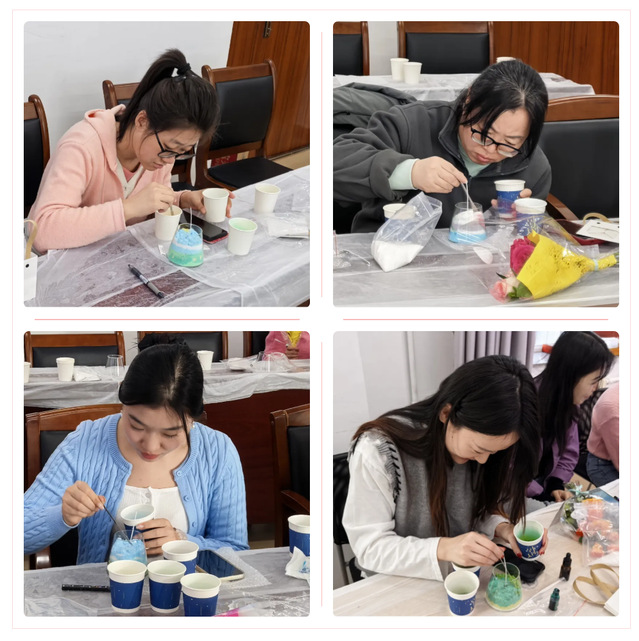 活动现场暖意融融、氛围浓厚。挑细沙、配香薰、摆装饰……女教工们化身“创意设计师”潜心创作,将细腻沙粒层层铺叠,勾勒出独特灵动的纹路,在填注搭配间,寄托对生活的热爱与期许。